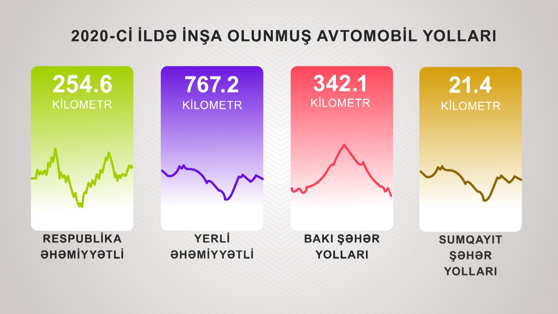 Azərbaycan Avtomobil Yolları Dövlət Agentliyinin kollektivi tərəfindən 2020-ci il ərzində 1385,3 km uzunluğunda avtomobil yolları, prospekt və küçələr tikilmiş, yenidən qurulmuş və təmir olunmuşdur.