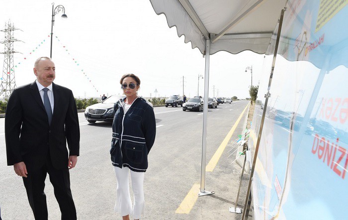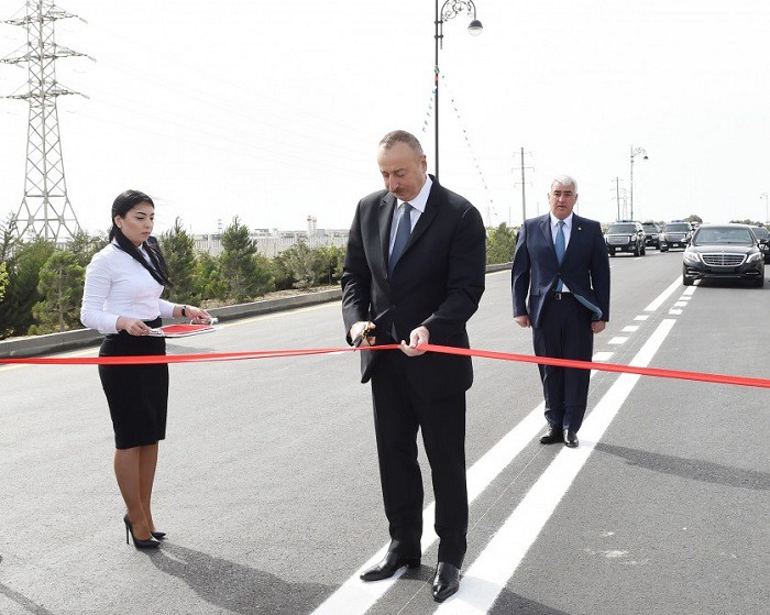Dövlətimizin başçısı yolun rəmzi açılışını bildirən lenti kəsdi və avtomobili idarə etdi.